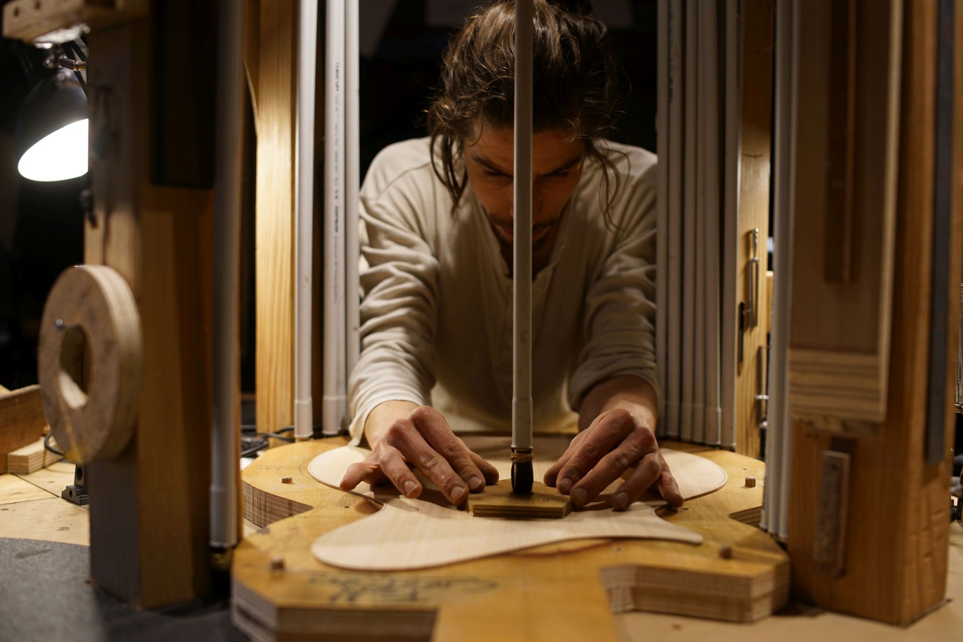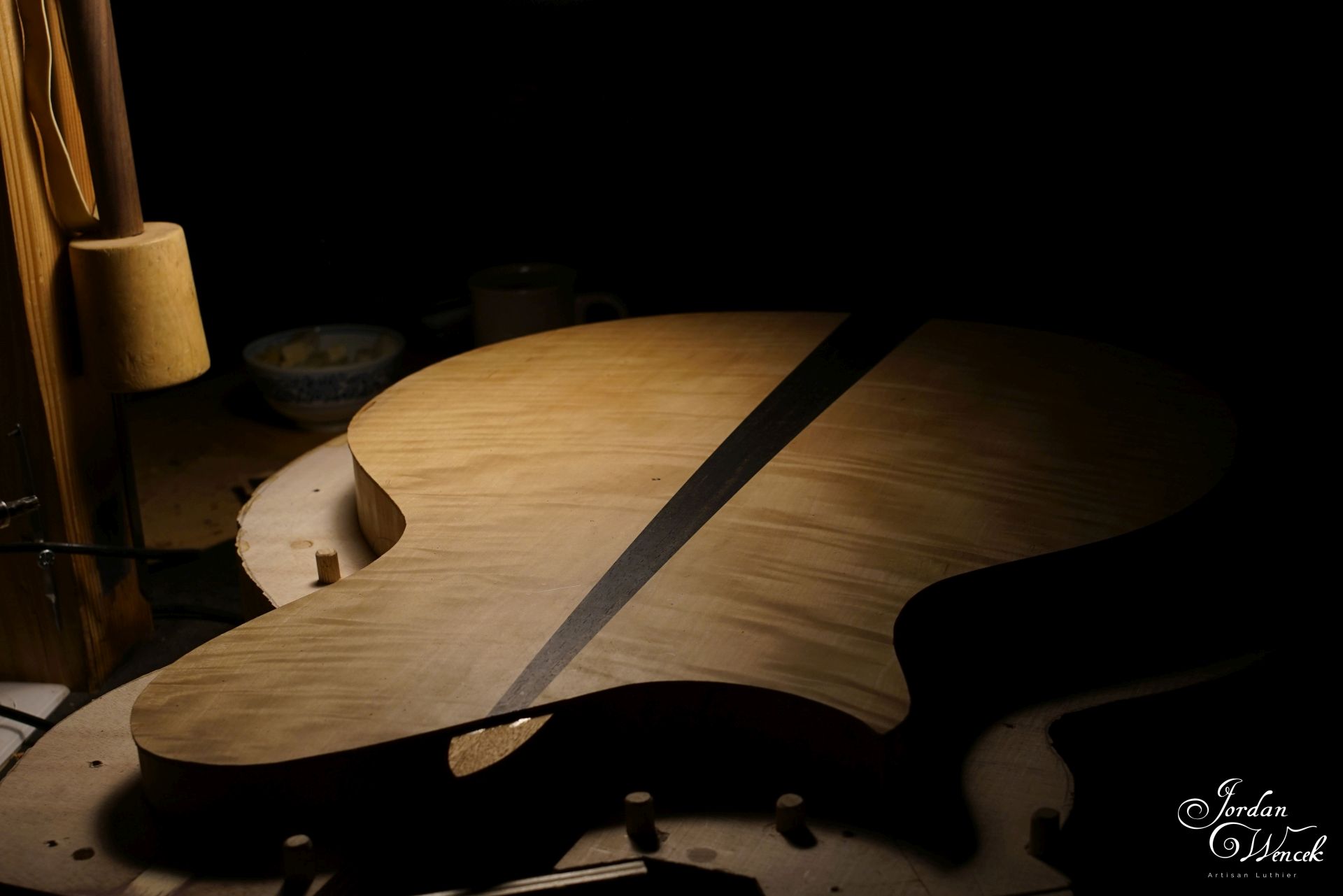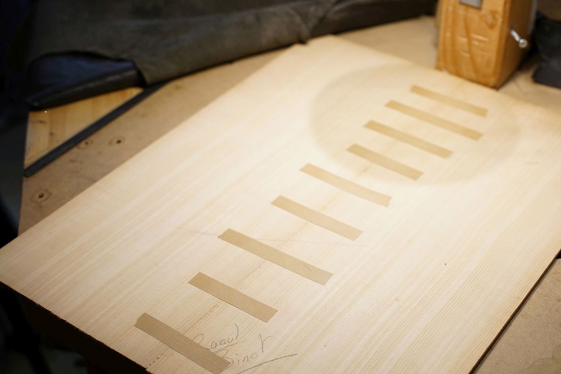 Jointage et collage de la table en épicéa sitka. Sobre à première vue mais les rayons médullaires sont juste dingues !