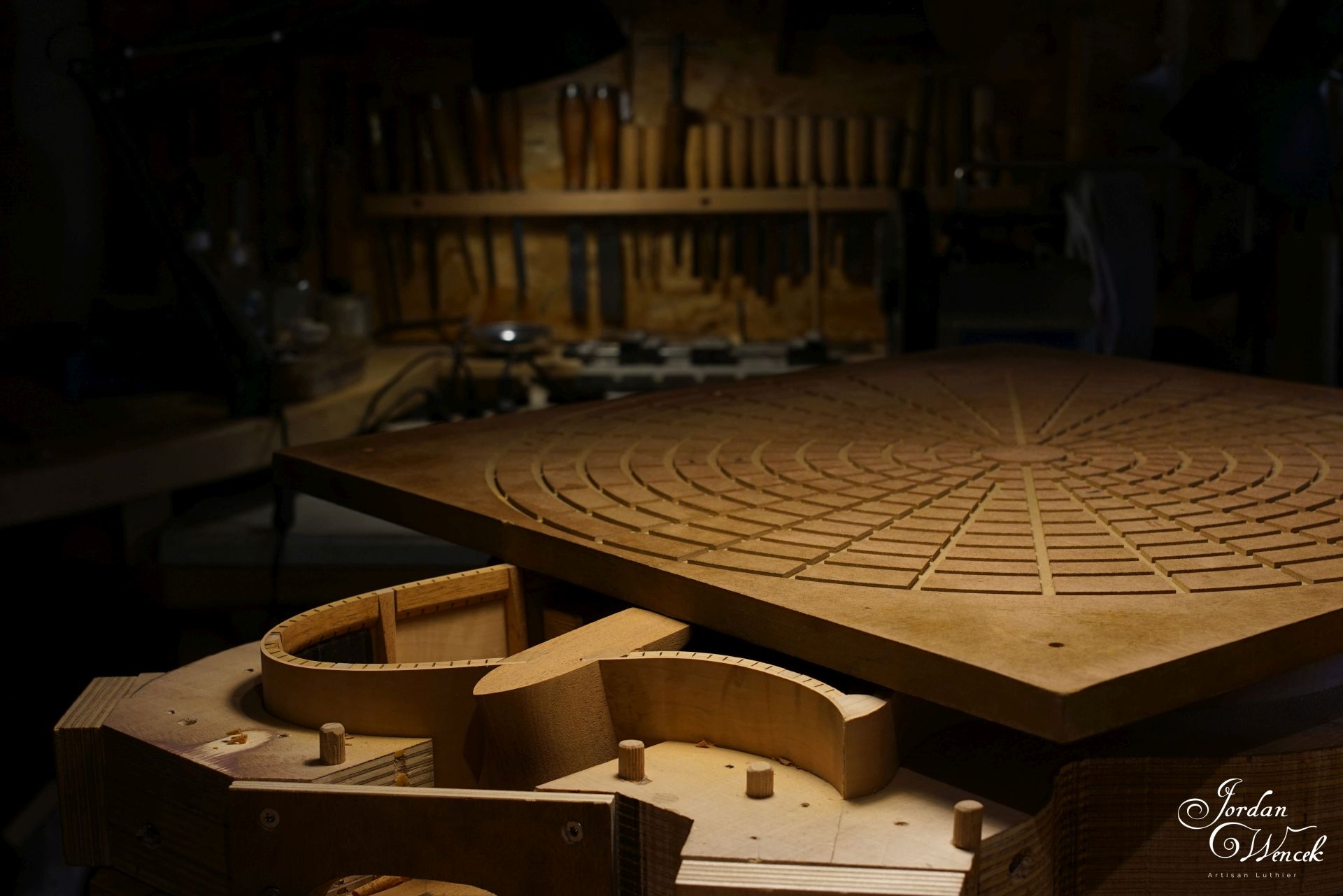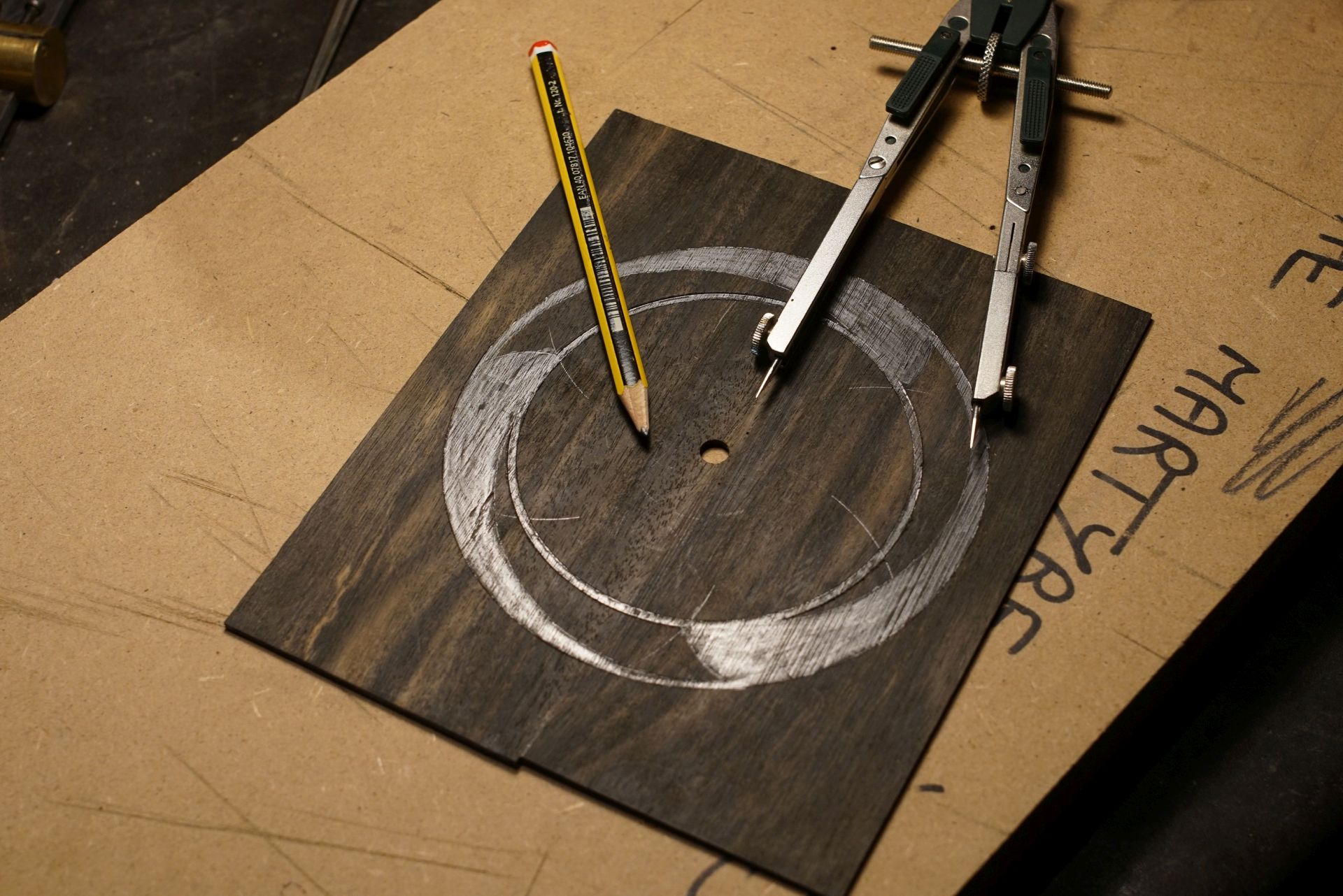 Première étape de la rosace qui sera en ébène et en poirier ondé ... On sort le compas et le circle cutter :)