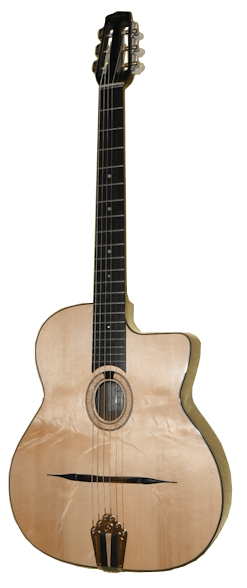 Le tout dernier bébé jazz de l’atelier. Format lui aussi plus généreux que le modèle Selmer sa création est venue combler des demandes récurrentes de plusieurs musiciens souhaitant un son à la fois riche et puissant, une guitare réactive et facile à jouer. Le tout combiné à un choix de bois donnant telle ou telle caractéristique sonore, les possibilités sont énormes !